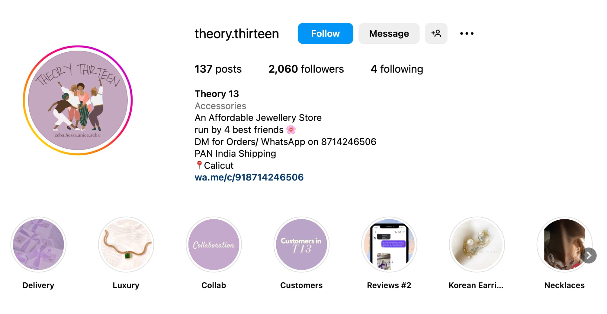 കോഴിക്കോട് സ്വദേശിനികളായ ‘സേബ, ഹെസ്സ, ആനിസ്, സെബ’ എന്നിവർ ചേർന്ന് തുടങ്ങിയ സംരംഭമാണ് “Theory 13” (theory.thirteen).ഇൻസ്റ്റാഗ്രാം പ്ലാറ്റ്ഫോമിലൂടെ യുവ തലമുറയുടെ ഇടയിലേക്ക് നവീനവും ആകർഷകവുമായ ആഭരണങ്ങൾ (മാലകൾ, കമ്മലുകൾ, മോതിരങ്ങൾ, ബ്രെയ്സ്ലെറ്റുകൾ) മിതമായ നിരക്കിൽ എത്തിക്കുക എന്ന ലക്ഷ്യത്തോടെ ആണ് Theory 13 സ്റ്റാർട്ട് ചെയ്തത്. കേരളത്തിൽ ഇത്തരം സംരംഭങ്ങൾ കുറവായതുകൊണ്ട് തന്നെ, തുടങ്ങി ഒരു മാസത്തിനകം തന്നെ വലിയ നേട്ടം കൈവരിക്കാൻ കഴിഞ്ഞു.