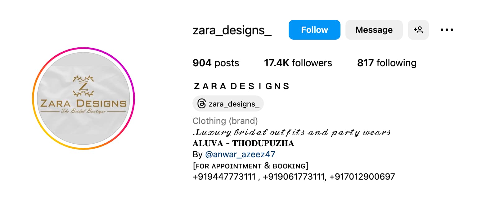 പെരുമ്പാവൂർ സ്വദേശി അൻവറിന്റെ ബ്രൈഡൽ ഡിസൈനർ ബൊട്ടിക് ആണ് Zara Designs.2015 ൽ ആലുവയിൽ ചെറിയ ഒരു സ്റ്റോർ ആയി തുടങ്ങി ഇന്ന് 2000 Sqft ഔട്ലറ്റിലേക്ക് Zara Designs വളർന്നു.ആലുവയിൽ കൂടാതെ തൊടുപുഴയിലും സാറാ ഡിസൈൻസിനു ഔട്ലറ്റ് ഉണ്ട്.ഇപ്പോൾ റീറ്റെയ്ൽ ബിസിനസ്സ് കൂടാതെ ലെഹങ്കാസിന്റെ ഹോൾസെയിൽ ബിസിനസ്സ് കൂടെ തുടങ്ങിയിരിക്കുകയാണ് അൻവർ . ആലുവയിലെ ഔട്ലറ്റിൽ ബ്രൈഡൽ ലെഹങ്കാസിനായി ഒരു സെക്ഷൻ തന്നെ ഉണ്ട്.കൂടാതെ കസ്റ്റമൈസ്ഡ് വർക്കുകൾക്കായി ഒരു സെപ്പറേറ്റ് സെക്ഷനും ഉണ്ട്.
