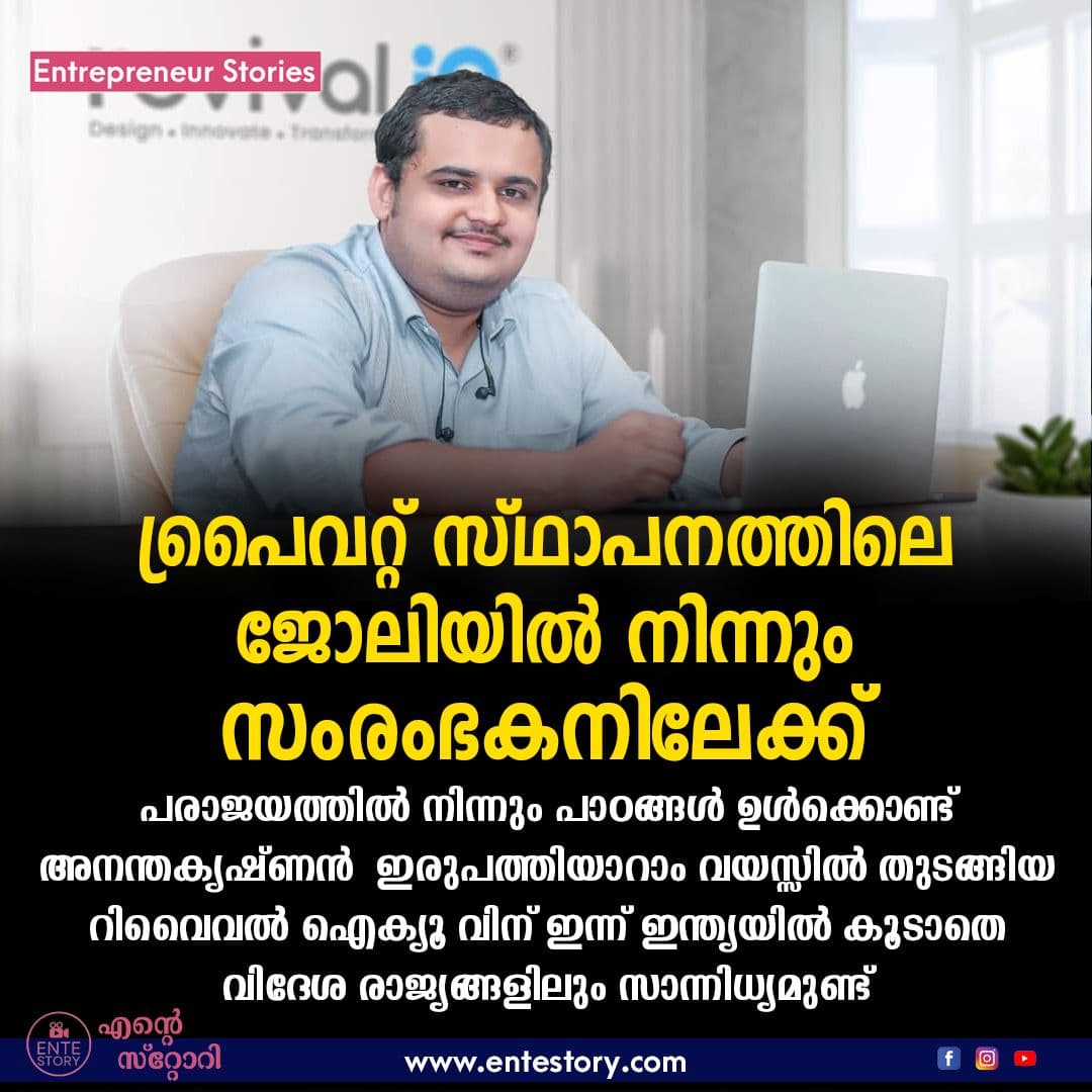കോട്ടയം സ്വദേശി അനന്തകൃഷ്ണൻ തന്റെ ഇരുപത്തിയാറാം വയസ്സിൽ തുടങ്ങിയ സംരംഭമാണ് Revival IQ (@revival_iq).ഡിജിറ്റൽ മാർക്കറ്റിങ് , വെബ് ഡിസൈനിങ് ,വെബ് ഡെവലപ്മെന്റ് ,ബ്രാൻഡിംഗ് ,എസ്ഇഓ , മൊബൈൽ ആപ്പ് ഡെവലപ്മെന്റ്, ഇ കോമേഴ്സ് എന്നിങ്ങനെ ഡിജിറ്റൽ മേഖലയുമായി ബന്ധപ്പെട്ട സേവനങ്ങൾ ആണ് Revival IQ നൽകി വരുന്നത്.”സ്വപ്നങ്ങൾ കാണാൻ ഉള്ളതല്ല നേടാൻ ഉള്ളതാണ് “.. അനന്തകൃഷ്ണൻ തന്റെ സ്വപ്നങ്ങൾ നേടി എടുക്കുവാൻ പരിശ്രമിച്ചു ഹാർഡ് വർക്ക് ചെയ്തു.ഇടയിൽ പല പ്രതിസന്ധികൾ നേരിടേണ്ടി വന്നെങ്കിലും പാഷനെ ഫോളോ ചെയ്തു മുന്നോട്ട് തന്നെ പോയി.ആ ഹാർഡ് വർക്കിന്റെ റിസൾട്ട് ആണ് Revival IQ എന്ന കമ്പനി..