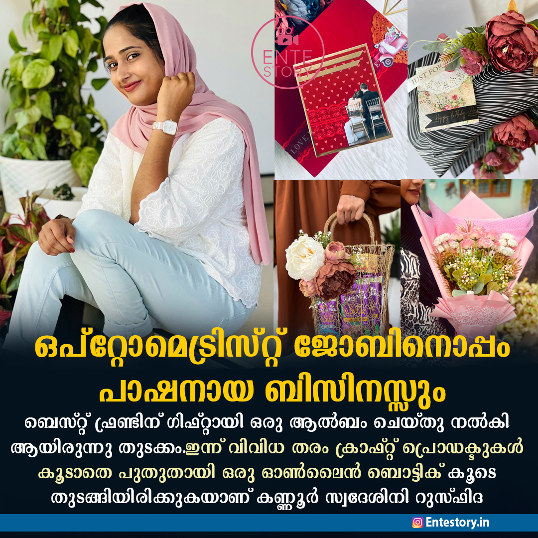 കണ്ണൂർ സ്വദേശിനി റുസ്ഫിദയുടെ സംരംഭങ്ങളാണ് @optom_crafter & @bellabloom_2022 .പ്രൊഫഷണലി ഒപ്റ്റോമെട്രിസ്റ്റ് ആയ റുസ്ഫിദ കഴിഞ്ഞ 3 വർഷമായി ജോലി ചെയ്യുന്നതിനൊപ്പം തന്നെ ആണ് പാഷനായ തന്റെ ബിസിനസ്സും മുന്നോട്ട് കൊണ്ട് പോകുന്നത്. @optom_crafter ലൂടെ വിവിധ തരം ഹാമ്പറുകൾ ,സ്ക്രാപ്പ്ബുക്ക് ,ഫ്രയിമുകൾ ഒക്കെ നിർമ്മിച്ച് നൽകുന്നു . @bellabloom_2022 ഒരു ഓൺലൈൻ ബൊട്ടീക്ക് ആണ് . ട്രെൻഡിങ് ആയ ഫാഷൻ പ്രൊഡക്ടുകൾ അതിലൂടെ സെൽ ചെയ്യുന്നു. വരുമാനം ഉപയോഗിച്ച് പേരന്റ്സിന്റെ തന്നാലാവും വിധം സപ്പോർട്ട് ചെയ്യാനും പല ആഗ്രഹങ്ങളും ഇൻഡിപെൻഡന്റ് ആയി തന്നെ നേടിയെടുക്കുവാനും കഴിയുന്നു.