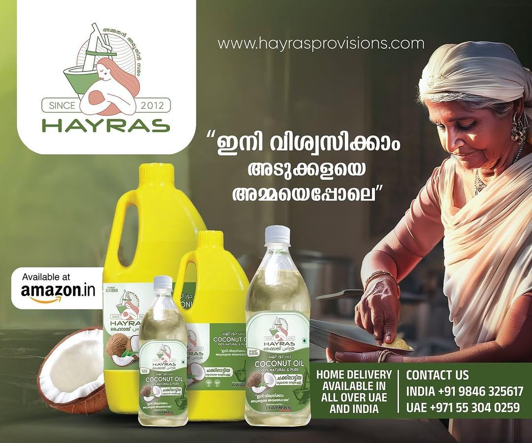 Raviz, Panoor, Calicut Chef, അടക്കം UAE മലയാളികൾ ഏറ്റവുമധികം നാടൻ ഭക്ഷണത്തിനായി ആശ്രയിക്കുന്ന എല്ലാ പ്രമുഖ പ്രീമിയം മലയാളി റെസ്റ്റോറന്റ് ചെയിനുകളിലെയും രുചിക്കൂട്ടിലെ പ്രധാന രഹസ്യം ഒരു തനിനാടൻ ചക്കിലാട്ടിയ വെളിച്ചെണ്ണയാണ്. നാട്ടിൽ നിന്ന് സ്വന്തമായി ഉല്പാദിപ്പിക്കുന്ന കൊപ്ര ചക്കിലാട്ടി, തനതുരീതിയിൽ അതിന്റെ ഗുണവും മണവും രുചിയും ഒന്നുംതന്നെ നഷ്ട്ടപ്പെടാതെ UAE യിലേക്ക് Manufacturers തന്നെ നേരിട്ടെത്തിക്കുന്ന വെളിച്ചെണ്ണയാണ് ഹൈറാസിന്റേത്. തങ്ങളുടെ വെളിച്ചെണ്ണയിൽ തരി പോലും മായം കലർന്നിട്ടില്ല എന്ന 100% കോൺഫിഡൻസിലാണ് 1% എങ്കിലും മായം തെളിയിച്ചാൽ 1 കോടി രൂപ സമ്മാനമെന്ന ഹൈറാസിന്റെ പരസ്യത്തിന്റെ tagline ഉം പിറന്നത്.