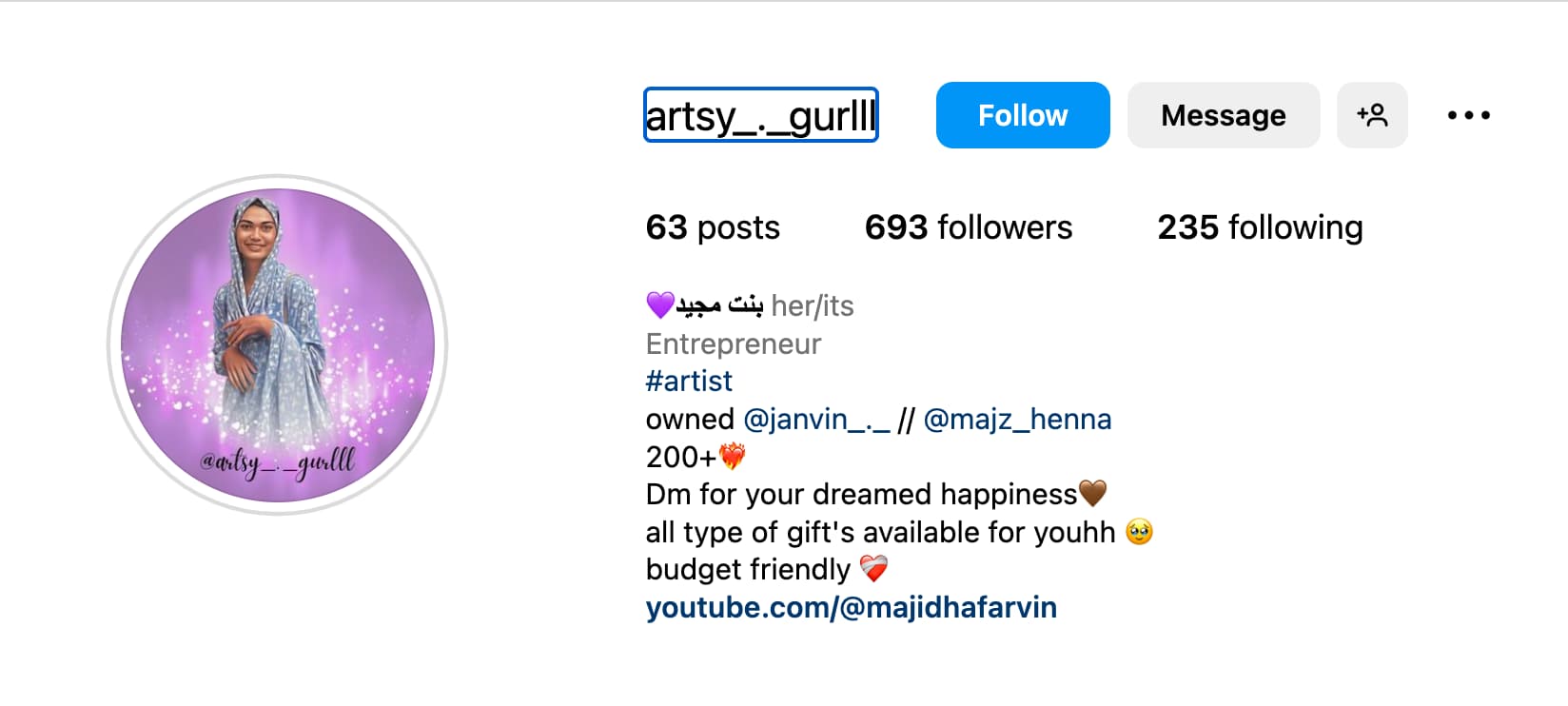 മലപ്പുറം സ്വദേശിനി മാജിദ ഫർവിന്റെ സംരംഭമാണ് Artsy_._gurlll .സ്ട്രിംഗ് ആർട്ട് ,സ്ട്രിംഗ് ആർട്ട് നെയിം പ്ളേറ്റ് ,വിവിധ തരം ഗിഫ്റ്റ് ഹാമ്പറുകൾ ഒക്കെ നിർമ്മിച്ചു നൽകുന്നു.കൂടാതെ majz_henna യിലൂടെ ബ്രൈഡൽ ഹെന്ന വർക്കുകളും ചെയ്തു നൽകുന്നു.ചെയ്യുന്ന വർക്കുകൾ എവിടേലും സൂക്ഷിച്ചു വെക്കുവാൻ ആണ് ഇൻസ്റ്റഗ്രാം അക്കൗണ്ട് തുടങ്ങിയത്.ആർട്ട് വർക്കും ,ഹെന്ന വർക്കും എല്ലാം ഒരു അക്കൗണ്ടിൽ തന്നെ ആയിരുന്നു പോസ്റ്റ് ചെയ്തിരുന്നത്.പിന്നീട് ആണ് രണ്ടും സെപ്പറേറ്റ് ചെയ്തത്.ഇതിനിടയിൽ തുടങ്ങിയ അക്കൗണ്ട് ഹാക്ക് ആയി നഷ്ടമായി.അടുത്ത അക്കൗണ്ട് തുടങ്ങിയെങ്കിലും അതും നഷ്ടമായി.എങ്കിലും തളരാതെ വീണ്ടും പരിശ്രമിച്ചു മുന്നോട്ട് തന്നെ പോയി.ആരൊക്കെ തളർത്താൻ നോക്കിയാലും നിർത്തില്ല എന്ന തീരുമാനം ആയിരുന്നു മുന്നോട്ട് തന്നെ നയിച്ചത്.വർക്കുകൾ ചെയ്തു നൽകി കിട്ടുന്ന വരുമാനത്തിലൂടെ പേരെന്റ്സിനെ ബുദ്ധിമുട്ടിപ്പിക്കാതെ ചെറിയ ചെറിയ ആഗ്രഹങ്ങൾ നേടി എടുക്കുവാൻ കഴിയുന്നു. കുഞ്ഞു കുഞ്ഞു നേട്ടങ്ങളിൽ വീട്ടുകാരുടെയും ടീച്ചർമാരുടെയും കൂട്ടുകാരുടെയും എല്ലാം നല്ല സപ്പോർട്ട് ലഭിക്കുന്നു.