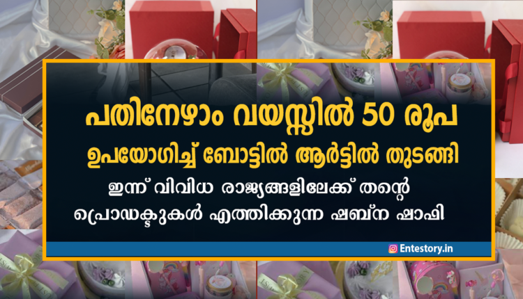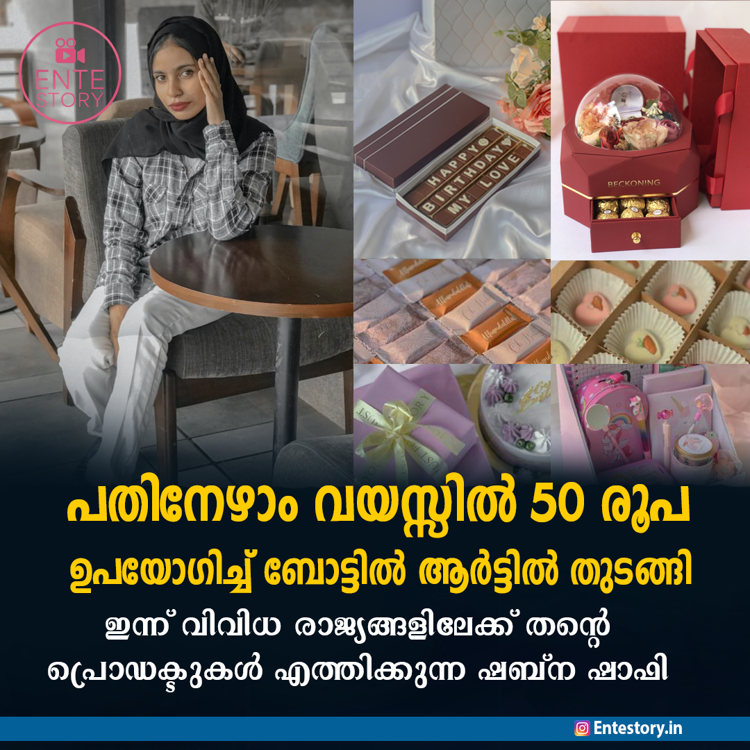 ഡിഗ്രി അവസാന വർഷ വിദ്യാർത്ഥി ആയ കാസർഗോഡ് സ്വദേശിനി ഷബ്ന ഷാഫിക്ക് സ്വന്തമായി രണ്ടു സംരംഭങ്ങൾ ആണ് ഉള്ളത്.Zain _ Arties എന്ന ഇൻസ്റ്റാഗ്രാം പേജിലൂടെ ഗിഫ്റ്റ് ഹാമ്പറുകൾ, വിവിധ ക്രാഫ്റ്റ് പ്രൊഡക്ടുകൾ , Resin Jewelleries ,Key Chains ,Frames ഒക്കെ നിർമ്മിച്ച് സെൽ ചെയ്യുന്നു.കൂടാതെ Choco.Palette എന്ന ബ്രാൻഡിൽ ഹോം മേഡ് ചോക്ലേറ്റുകളും വിപണിയിൽ എത്തിക്കുന്നു.പതിനേഴാം വയസ്സിൽ പ്ലസ് വണ്ണിന് പഠിക്കുമ്പോൾ 50 രൂപ ഉപയോഗിച്ച് ബോട്ടിൽ ആർട്ട് ചെയ്താണ് തുടക്കം.ഇന്ന് ഇന്ത്യ കൂടാതെ ,യുഎഇ,ബഹ്റൈൻ,ഒമാൻ ,സൗദി ഉൾപ്പടെ ഉള്ള ഗൾഫ് രാജ്യങ്ങളിലക്കും ലണ്ടൻ ,സിംഗപ്പൂർ , മാൾട്ട , കാനഡ തുടങ്ങി നിരവധി രാജ്യങ്ങളിലേക്കും തന്റെ പ്രൊഡക്ടുകൾ ഷബ്ന സെൽ ചെയ്യുന്നുണ്ട്.